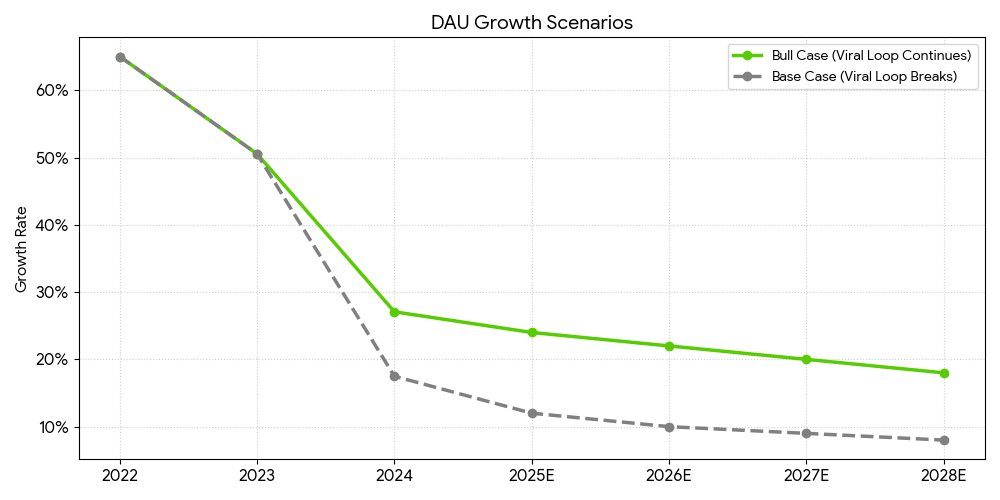 The difference between the stock going nowhere and doubling comes down to two lines. If the 'Viral Loop' breaks, we follow the grey line. If the 'Unhinged' marketing keeps working, we follow the green.