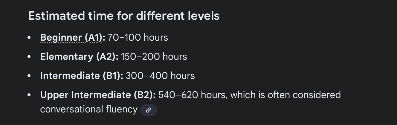 To get to intermediate, a level where you could hold a basic conversation, you’d need 300-400 hours of classroom study, that is 10 years of ground-floor Duolingo.
